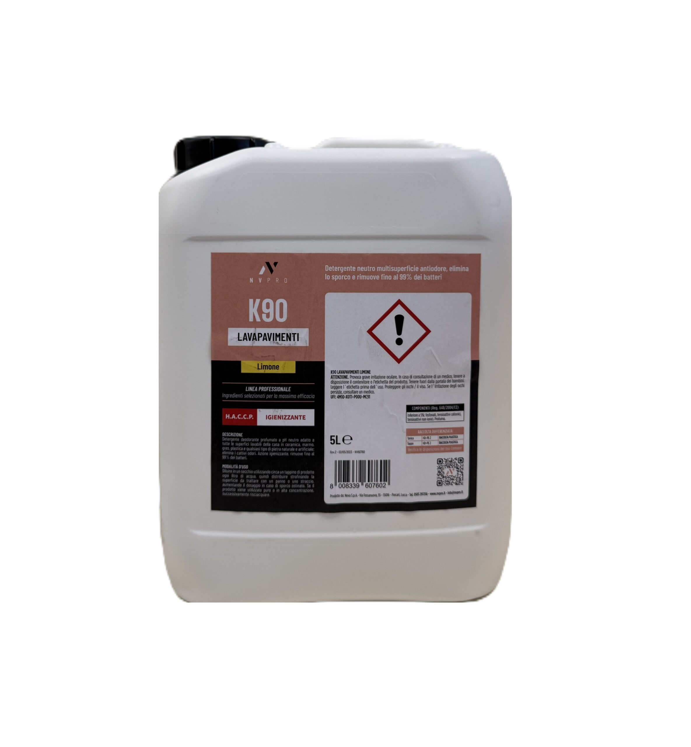 Il sapone lavapavimenti K 90 è un detergente neutro professionale per pavimenti. È formulato per offrire un’azione igienizzante e deodorante su tutte le superfici lavabili, inclusi ceramica, marmo, gres, plastica e pietra naturale o artificiale. La sua formula elimina i cattivi odori e rimuove fino al 99% dei batteri, garantendo un ambiente più sano e pulito.